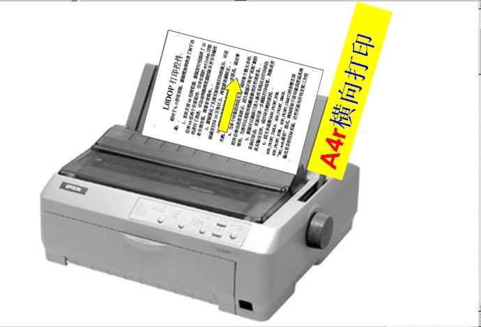 横向打印也叫旋转打印,输出时内容逆时针旋转90度,此时特别注意A4纸不能跟着旋转,一定按原放纸方式,下面是A4横向打印的效果,黄箭头代表走纸方向:
